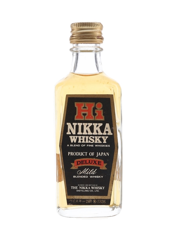 A miniature bottle of Nikka Hi Black Label Deluxe Mild Blended Japanese whisky, blended and bottled by The Nikka Whisky Distilling Co. Ltd.
