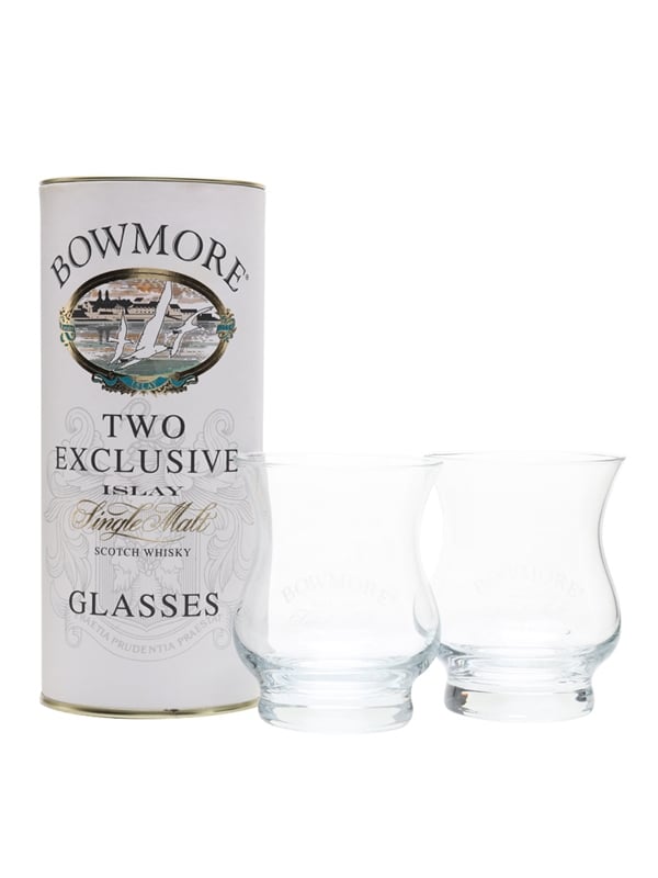 A pair of Bowmore Islay single malt Scotch whisky tumblers presented in a box.