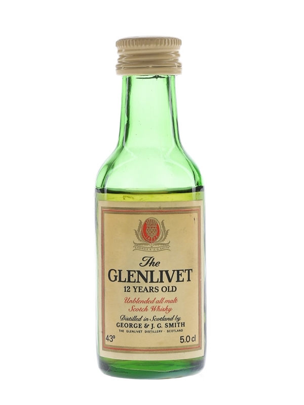A miniature bottle of The Glenlivet 12 Year Old Unblended All Malt Scotch Whisky, distilled in Scotland by George & J G Smith. We estimate this was bottled in the 1980s.