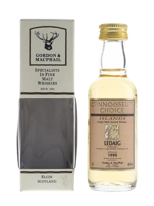 A miniature bottle of Ledaig Island Single Malt Scotch Whisky distilled in 1990, bottled by Gordon & MacPhail as part of the Connoisseurs Choice series. The bottling code indicates this was bottled in 1999.
