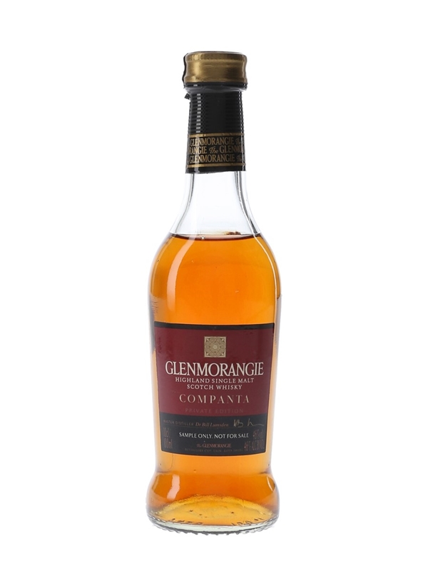 A 10cl sample bottle of Glenmorangie Companta, the fifth release in the Private Edition series. This whisky was matured in American oak casks before being finished in a combination of Clos de Tart and Côtes du Rhône wine casks.