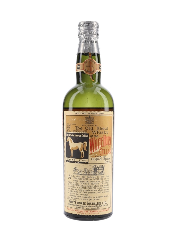 A bottle of The Old Blend of the White Horse Cellar Blended Scotch Whisky, bottled in 1938 by White Horse Distillers Ltd., Lagavulin Distillery, Island of Islay and Glenlivet District.