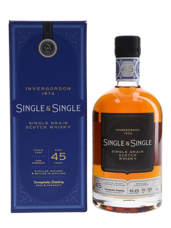 A bottle of Invergordon 45 Year Old Single Grain Scotch Whisky. This was distilled in 1974 and bottled at 46.6% ABV for Single & Single.