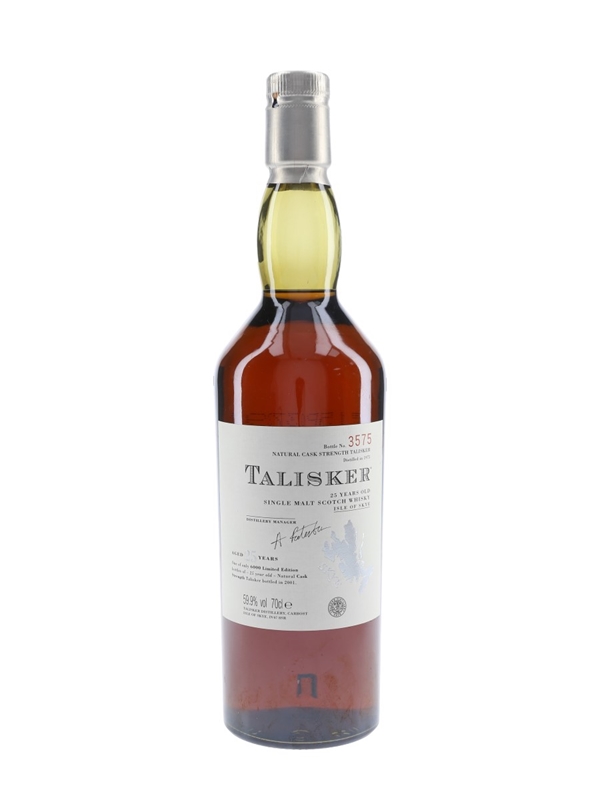 A bottle of Talisker 25 Year Old Single Malt Scotch Whisky. This was distilled in 1975 and bottled at cask strength in 2001 for Diageo's Special Releases.