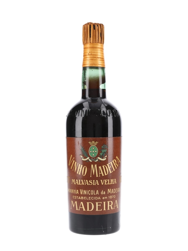 A bottle of Companhia Vinicola da Madeira Malvasia Velha 1877, a fortified wine made from the Malvasia grape variety.