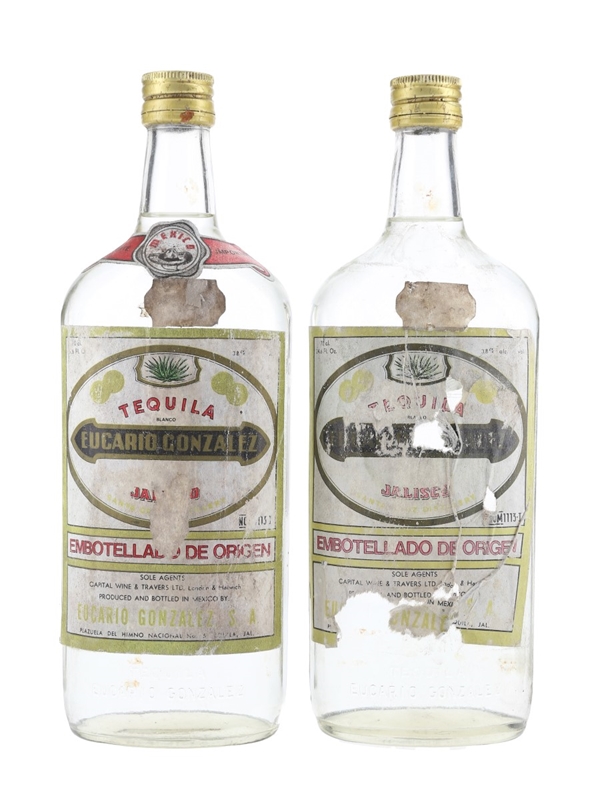 This lot contains two bottles of Tequila Blanco produced by Eucario Gonzalez at the Santa Cruz distillery in Jalisco. We estimate these were bottled in the 1970s.