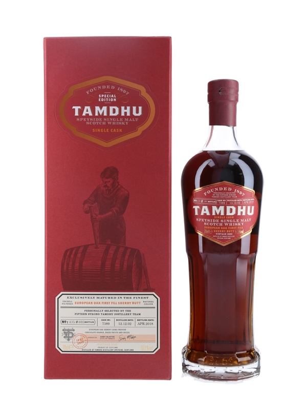 A special edition bottle of Tamdhu 2002 Speyside Single Malt Scotch Whisky. This was distilled in 2002, matured in a European oak first-fill sherry butt and bottled at 59.3% ABV in April 2018 to celebrate the distillery's 120th anniversary.