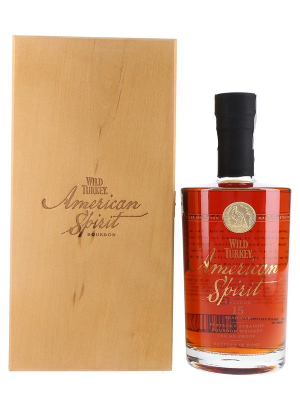 A bottle of Wild Turkey American Spirit 15 Year Old Kentucky bourbon, selected by Master Distiller Jimmy Russell and bottled at 50% ABV as part of Master Distiller Selection for the Japanese market.