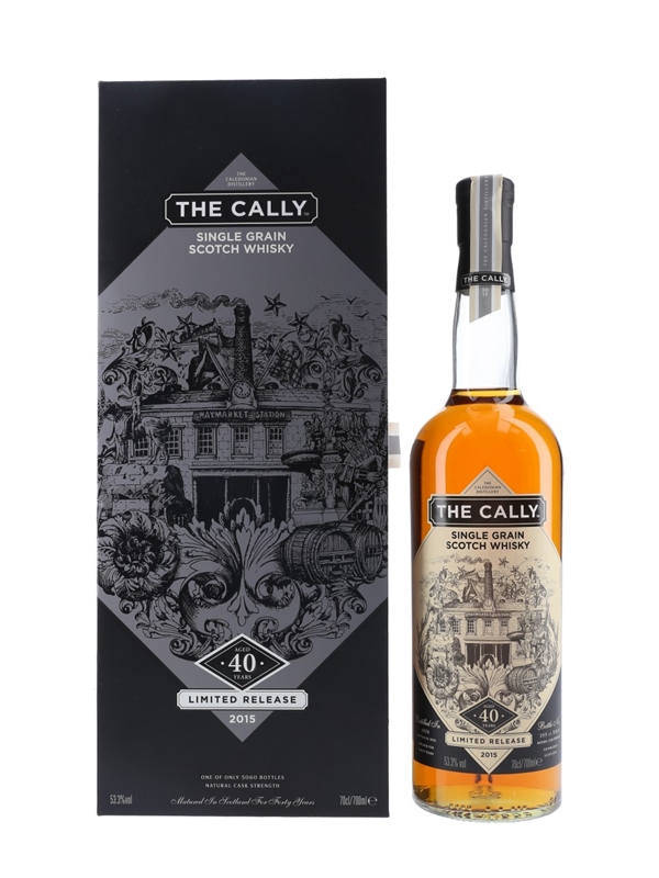 A bottle of The Cally 40 Year Old Single Grain Scotch Whisky. This was distilled in 1974 at The Caledonian Distillery and bottled as part of Diageo's Special Releases 2015.