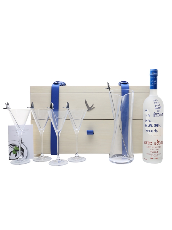 The Grey Goose Martini Gift Set contains a bottle of Grey Goose vodka, a large branded mixing glass, four martini glasses with olive picks and a branded stirrer. This limited edition set was designed by Ian R Webb and is presented in a fitted wooden case.