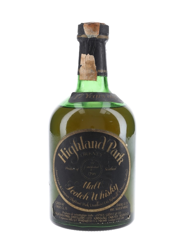 A bottle of Highland Park 17 Year Old Orkney Malt Scotch Whisky. This was distilled in 1958 and bottled by James Grant & Company in 1975. This was bottled for the Italian market and imported by Ferraretto.