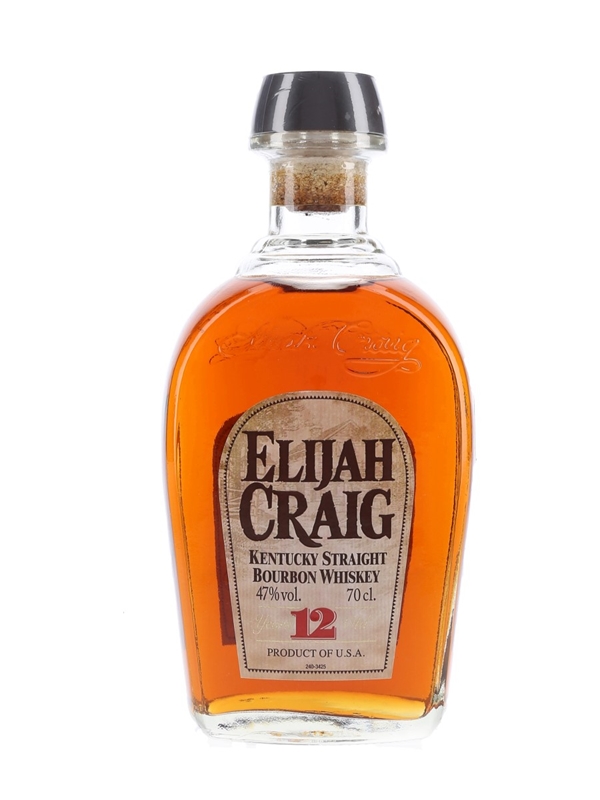 A bottle of Elijah Craig 12 Year Old Kentucky Straight Bourbon Whiskey. This was imported to the UK by Marussia Beverages UK Ltd.