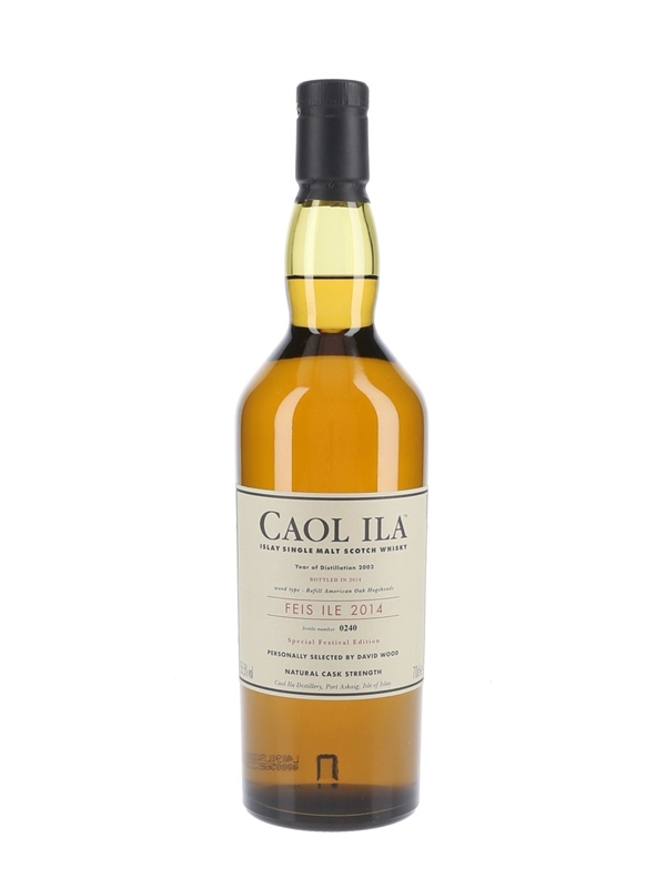A limited edition bottle of Caol Ila 2002 Islay Single Malt Scotch Whisky. This was matured in refill American oak hogshead casks selected by distillery manager David Wood, and bottled at cask strength in 2014 for Feis Ile, the Islay festival of music and malt. This was originally only available to purchase at the distillery.