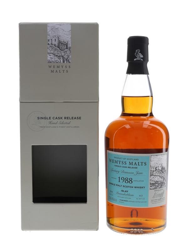 A bottle of Bunnahabhain 1988 Single Malt Scotch Whisky, bottled from a single cask in 2018 by Wemyss Malts, and subtitled Luxury Damson Jam.