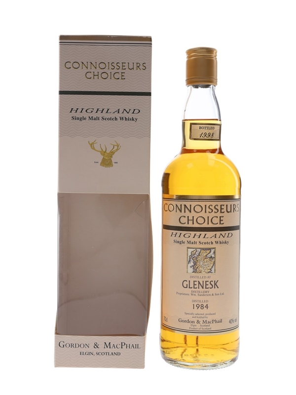 A bottle of Glenesk 1984 Highland Single Malt Scotch Whisky, bottled in 1998 by Gordon & MacPhail for the Connoisseurs Choice series.