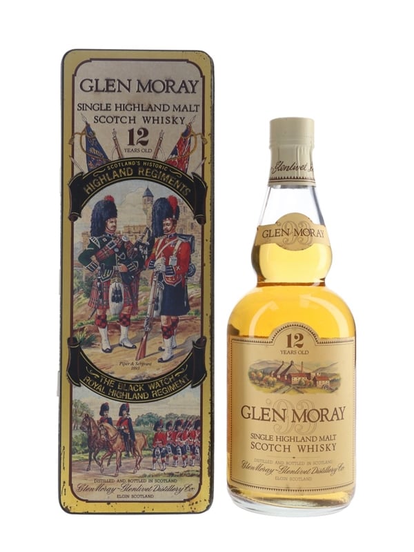 A bottle of Glen Moray 12 Year Old in a Scotland's Historic Highland Regiments tin. This tin depicts the Black Watch Royal Highland Regiment. We estimate this was bottled in the 1980s.