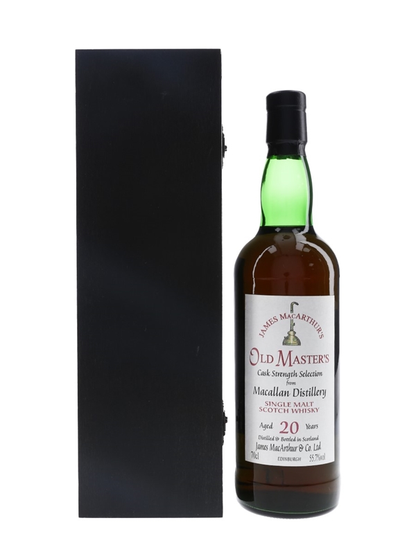 A bottle of Macallan 20 Year Old Single Malt Scotch Whisky, bottled at cask strength by James MacArthur's as a part of the Old Master's series.