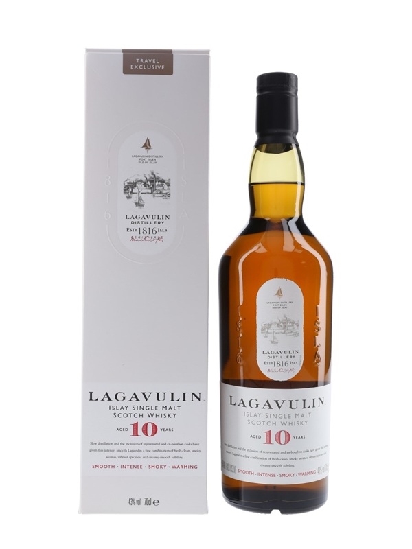 A bottle of Lagavulin 10 Year Old Islay Single Malt Scotch Whisky. This was matured in a combination of rejuvenated and ex-bourbon casks and was released exclusively for travel retail.