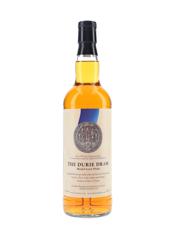A bottle of Durie Dram Blended Scotch Whisky produced by Adelphi Distillery. This was specially selected for the Durie family by the Chief of the Arms and Name, Andrew Durie of Durie.