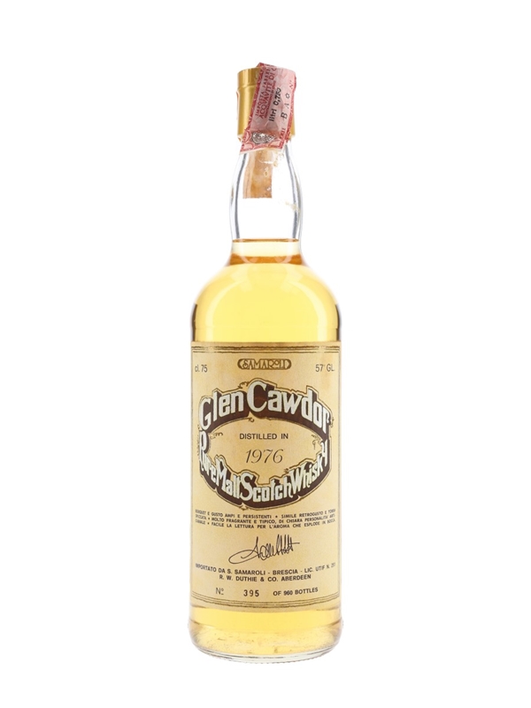 A bottle of Glen Cawdor 1976 Pure Malt Scotch Whisky. This was distilled in 1976 and bottled at cask strength by R W Duthie & Co. for Italian importer Samaroli, we estimate in the 1980s.