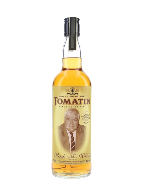 A bottle of Tomatin 12 Year Old Single Highland Malt Scotch Whisky, bottled on the occasion of John McDonald's retiral as Managing Director of the distillery.