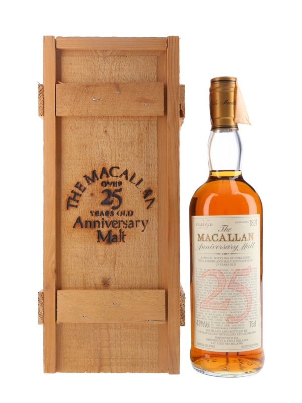 A bottle of The Macallan 1962 Unblended Single Highland Malt Scotch Whisky. This was matured in sherry casks for 25 years and bottled in 1988 as part of the Anniversary Malt series. This was produced for the Italian market and imported by Giovinetti & Figli.