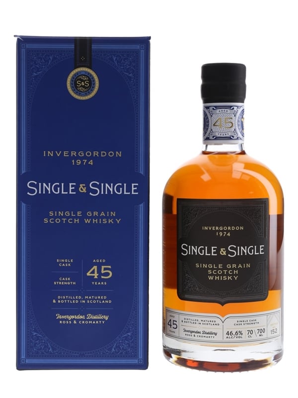 A bottle of Invergordon 45 Year Old Single Grain Scotch Whisky. This was distilled in 1974 and bottled at 46.6% ABV for Single & Single.