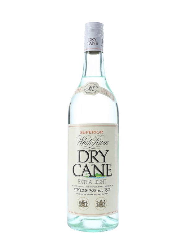 A bottle of Dry Cane Extra Light Superior White Rum. This was produced in Barbados and Guyana, we estimate in the late 1970s.