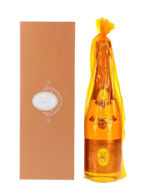 A bottle of 2007 vintage Louis Roederer Cristal Rosé Champagne, a blend of 56% Pinot Noir and 44% Chardonnay.