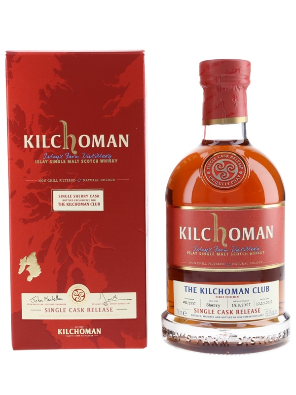 A bottle of Kilchoman First Edition Single Cask Release. This was distilled on 15 August 2007, matured in a single sherry cask and bottled at cask strength on 12 October 2012 for The Kilchoman Club.