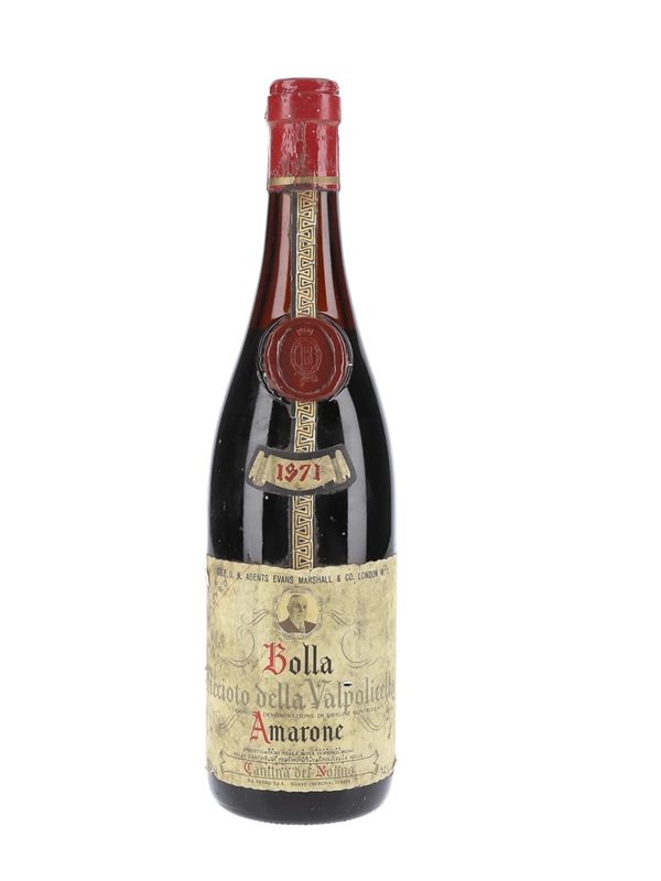 A bottle of 1971 Bolla Recioto Della Valpolicella Amarone, a full-bodied red wine made from partially dried Corvina, Rondinella and Molinara grapes.