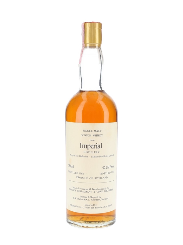 A bottle of Imperial Single Malt Scotch Whisky, distilled in 1963 and bottled in 1983 by RW Duthie & Co.