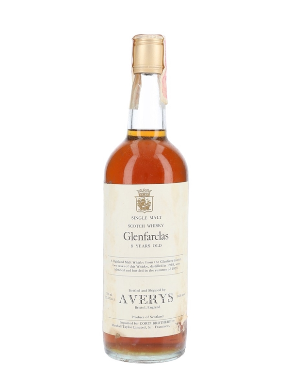 A bottle of Glenfarclas 8 Year Old Single Malt Scotch Whisky. This was distilled in 1969 and matured in two casks which were blended and bottled in the summer of 1978 by Averys, Bristol.
