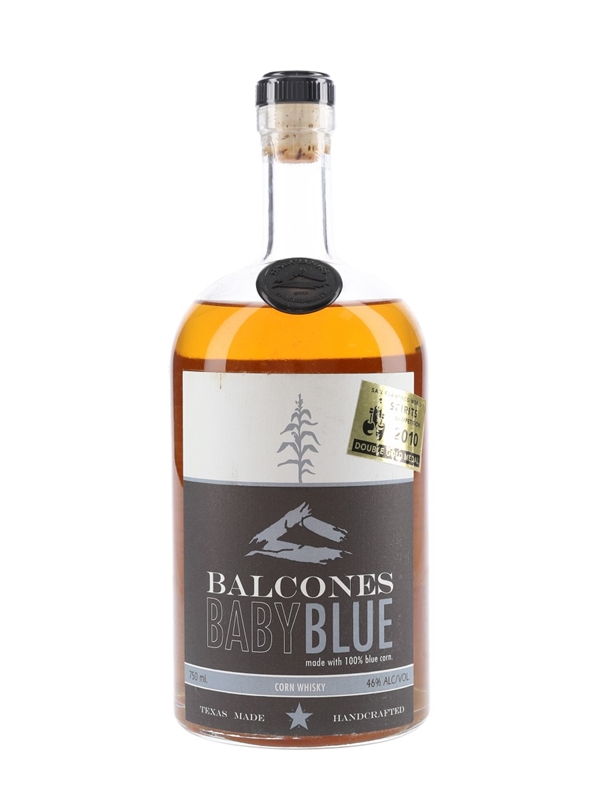 A bottle of Balcones Baby Blue, a Texan corn whisky made from blue corn. This whisky won double gold at the 2010 San Francisco World Spirits Competition.