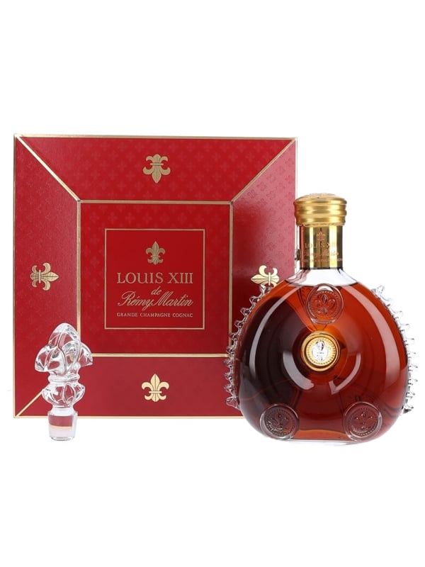 A bottle of Remy Martin Louis XIII Cognac, presented in a Baccarat crystal decanter with stopper. This is composed of Grande Champagne eaux-de-vie aged between 40 and 100 years and is presented in a Baccarat crystal decanter. We estimate this was bottled in the 1990s.