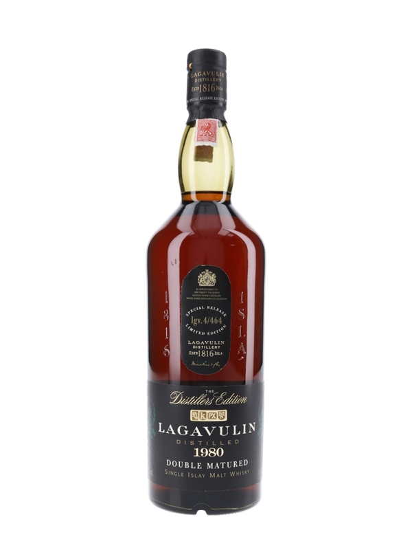 A litre bottle of Lagavulin 1980 Distillers Edition single Islay malt Scotch whisky. This was distilled when Lagavulin was part of White Horse Distillers and underwent extra maturation in Pedro Ximenez sherry casks before bottling.