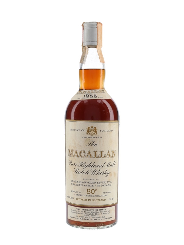 A bottle of The Macallan Single Highland Malt Scotch Whisky. This was distilled in 1958, matured in sherry wood and bottled by Campbell, Hope and King, we estimate in the 1970s. This was imported to Italy by Rinaldi.