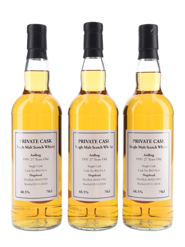 This lot contains three bottles of a private cask bottling of Ardbeg 27 Year Old Single Malt Scotch Whisky. These were distilled on 28 February 1991, matured in a single hogshead, and bottled at cask strength on 5 November 2018.