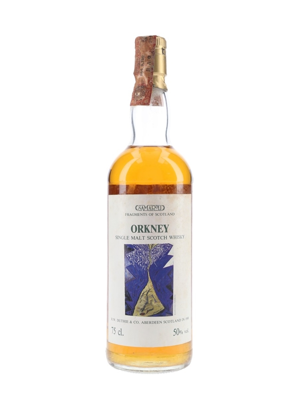 A bottle of Orkney 1977 Single Malt Scotch Whisky, bottled in 1988 by R W Duthie & Co. for Samaroli as part of the Fragments of Scotland series.