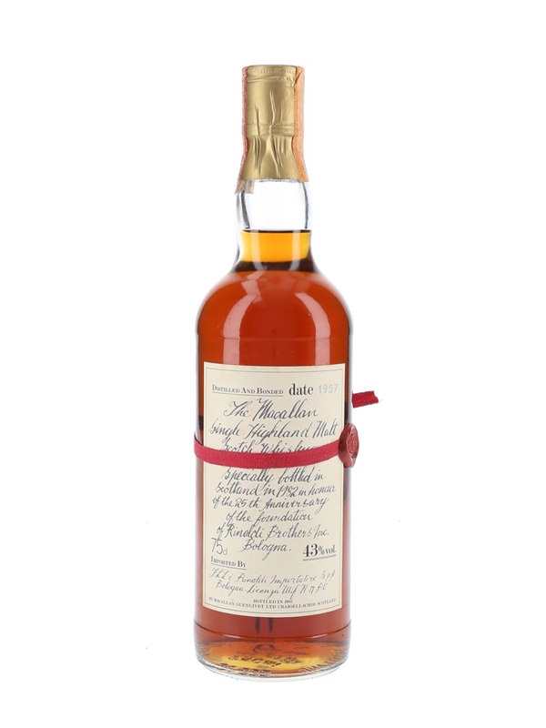 A bottle of The Macallan 1957, bottled in 1982 for Rinaldi to celebrate the Italian importer's 25th anniversary. This bottle has a handwritten label.