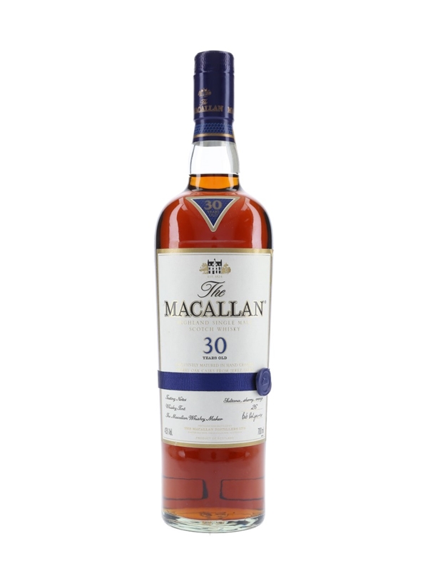 A bottle of The Macallan 30 Year Old Highland Single Malt Scotch Whisky, matured in oloroso sherry casks before bottling.