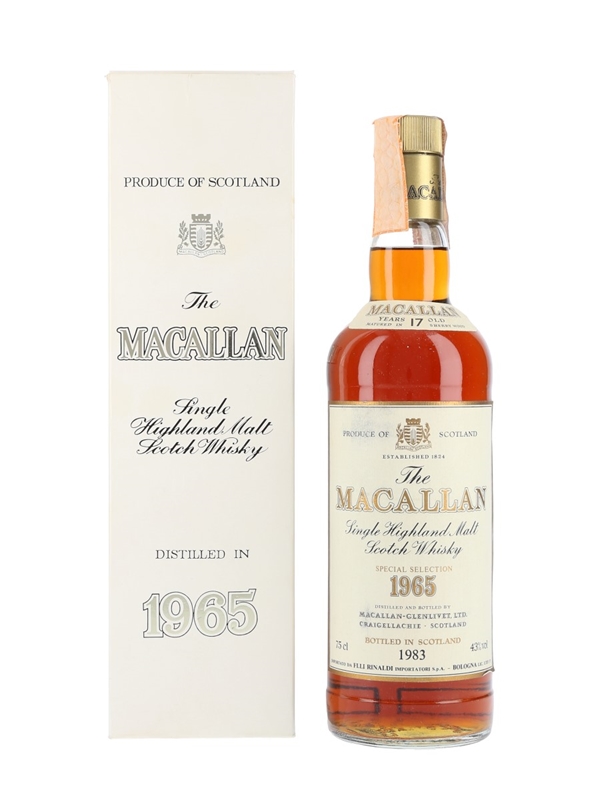 A bottle of The Macallan 17 Year Old. This was distilled in 1965 and bottled in 1983. It was imported for the Italian market by Rinaldi.