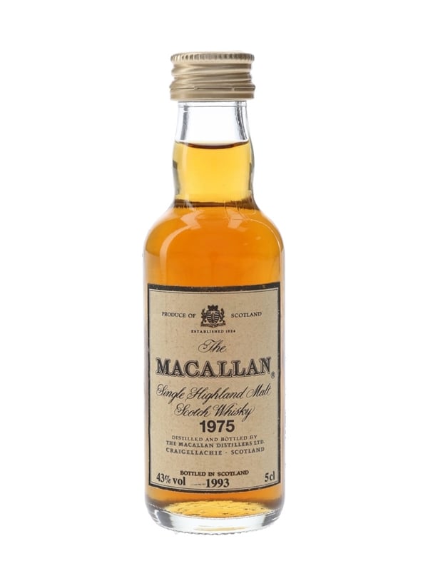 A miniature bottle of The Macallan 1975 Single Malt Scotch Whisky. This was distilled in 1975 and bottled in 1993 at 43% ABV.