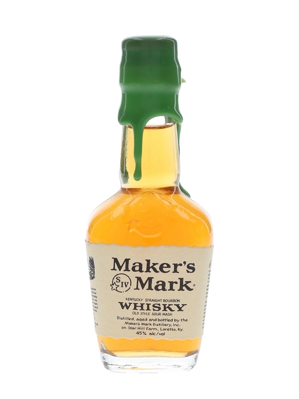 A miniature bottle of Maker's Mark Old Style Sour Mash Kentucky straight bourbon whisky with a green wax capsule.