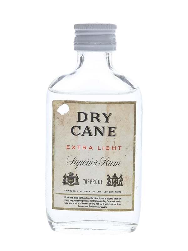 A miniature bottle of Dry Cane Extra Light Superior Rum, produced in Barbados and Guyana and bottled by Charles Kinloch & Co. Ltd., London NW10. We estimate this was bottled in the 1970s.