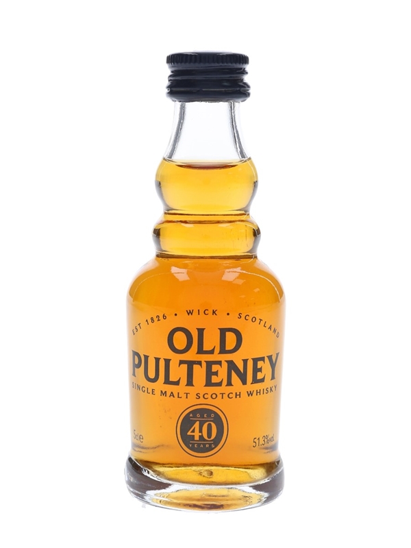 A miniature bottle of Old Pulteney 40 Year Old Single Malt Scotch Whisky, bottled at 51.3% ABV.