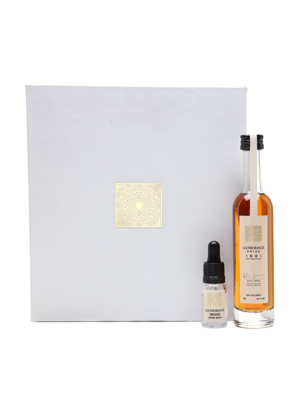 A 10cl sample bottle of Glenmorangie Pride 1981 Single Malt Scotch Whisky. This was distilled in 1981 and bottled in 2010. This comes with a sample of spring water from Tarlogie.