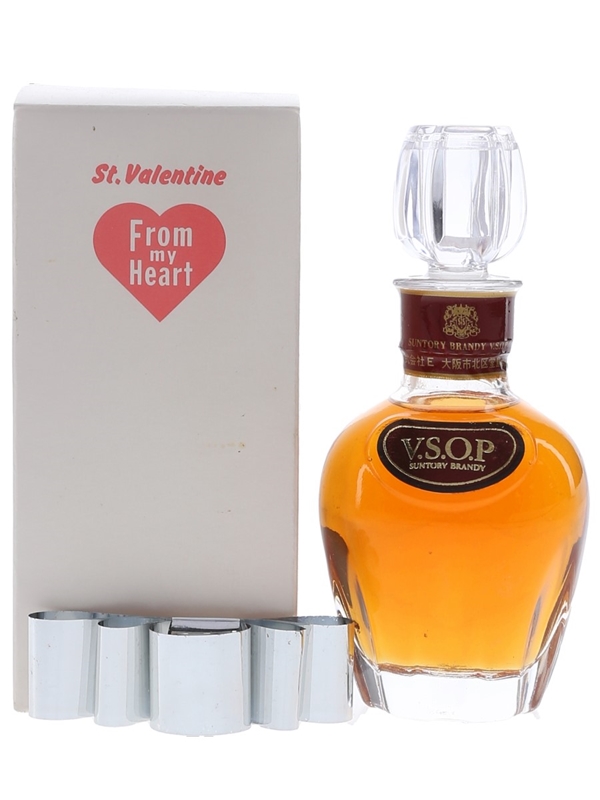 A miniature bottle of Suntory VSOP brandy presented in a glass decanter.