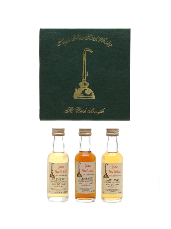 This set contains three miniature bottles of Highland Single Malt Scotch Whisky, bottled at cask strength by James MacArthur as part of the Fine Malt Selection:
