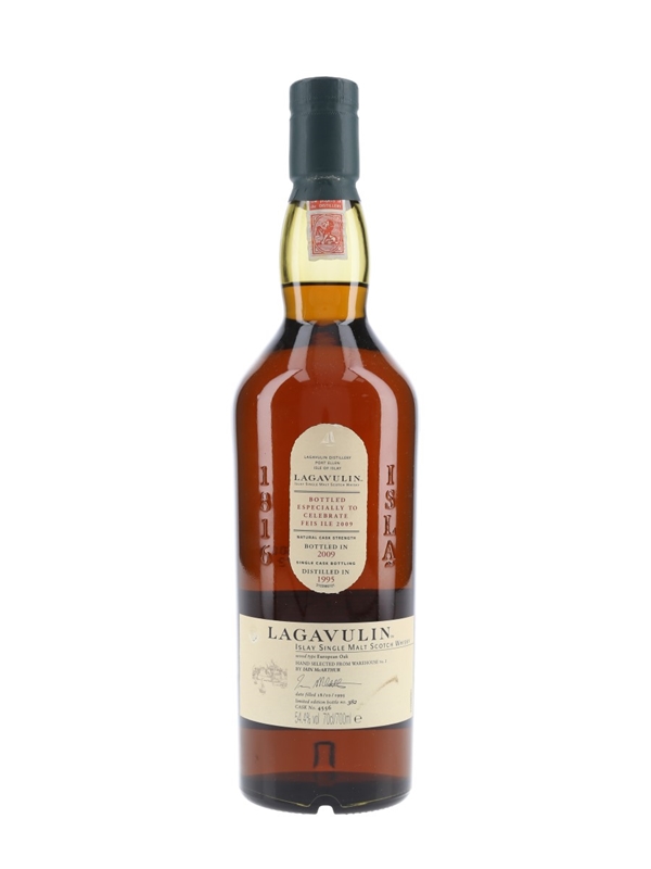 A bottle of Lagavulin Islay Single Malt Scotch Whisky. This was distilled on 18 October 1995, matured in an oak cask, hand selected by Iain McArthur and bottled especially for Feis Ile 2009, the Islay festival of music and malt.